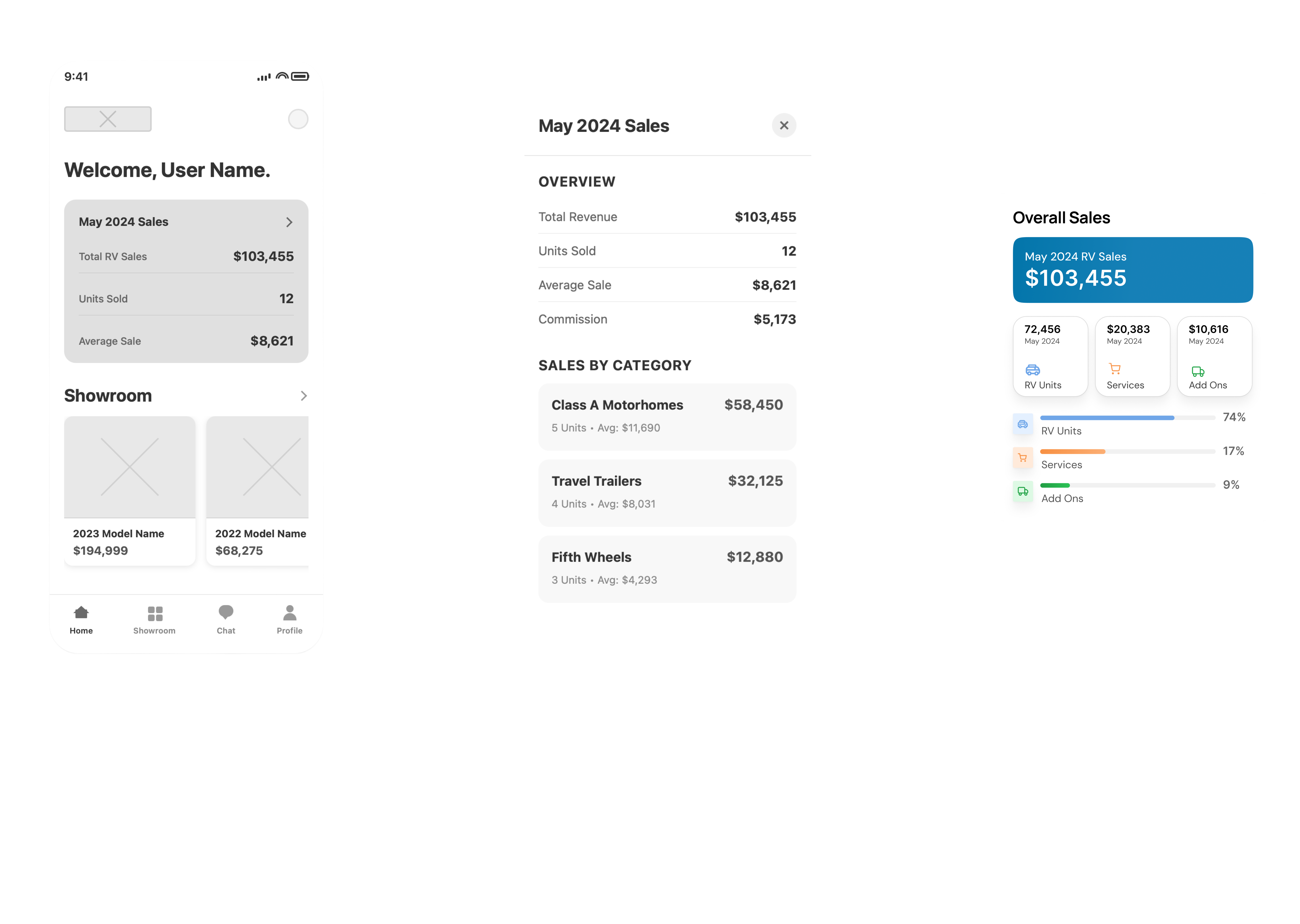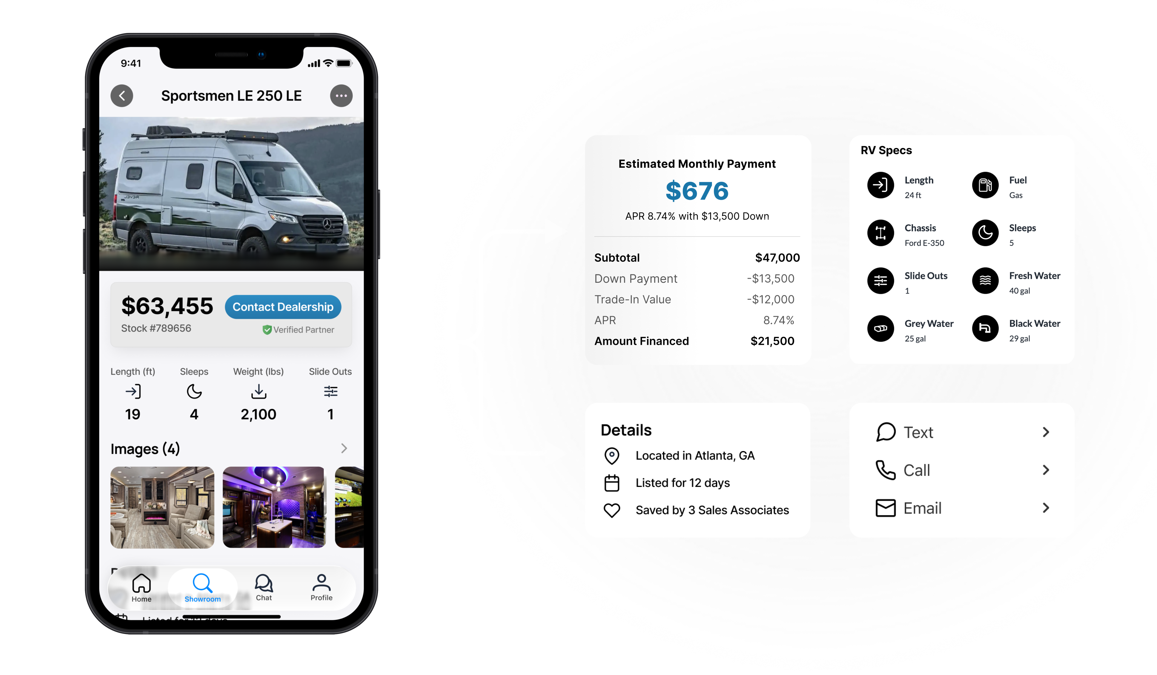The app brought essential sales tools together in one place, including estimated monthly payments, detailed RV specs, and location-specific inventory. Sales Associates could access everything they needed while staying in the flow of customer conversations. With communication tools baked directly into the experience, selling became faster, more informed, and more seamless.